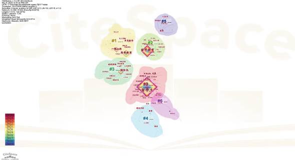 运用CiteSpace软件对有效样本进行机构分析,得到如图1所示,其中,Q值为0.9656,>0.3,S=1、>0.5,表明该研究机构共现结构显著,具有一定合理性。分析发现,以“