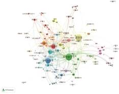 同时,利用 VOSviewer 软件的关键词 “共现” 功能,以彩色网络标签视图(图3)和密度视图(图4)呈现分析结果。在标签视图中,节点圆圈大小和位置反映关键词的词频与重要性;在密度视图中,色彩从蓝到红表示关键词共现频次和研究主题热度递增。