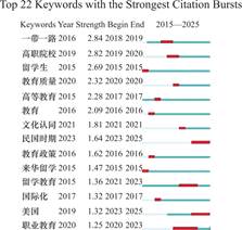 Abstract: International student education is of great significance in the context of internationalization of higher education. Although we have made remarkable achievements in the education of overseas students, we still face problems in teaching, management and interpersonal communication. This study uses VOSviewer and CiteSpace software to visually analyze 489 CSSCI and Peking University core journal literatures in KNOWnet from 2014 to 2025. According to the results, although institutions of higher learning are the main body of international student education research, there are still some problems such as insufficient institutional cooperation and emphasis on quantity over quality. The research results show that the keywords cluster into 6 groups, and the hot spots are concentrated in the fields of international student education, education development, and international education cooperation under the Belt and Road Initiative. The research process is also divided into three stages through analysis: foundation construction and policy-driven period (2015—2017) , regional cooperation and quality exploration period (2018—2020) , cultural identity and global game period (2021—2025) , and the focus direction is constantly changing. The Belt and Road Initiative and the internationalization of education have always been core hotspots. Through the above conclusions, it can provide an effective reference for the education of overseas students in China to move steadily towards a scientific, standardized and sustainable direction. Follow-up research should also focus on current hot spots and existing problems, and actively explore feasible optimization strategies.